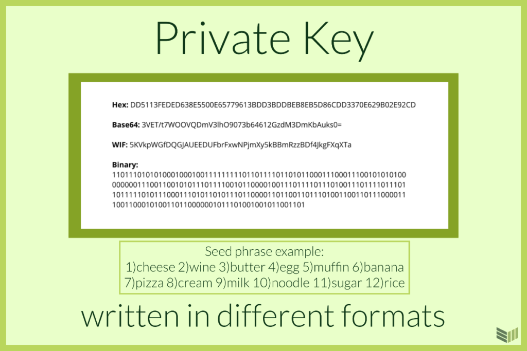 Las claves privadas son esencialmente contraseñas muy complejas, generadas aleatoriamente, que nos permiten acceder a nuestro bitcoin y verificar o «firmar» nuestras transacciones. Estas claves se representan en una «frase semilla» de 12 o 24 palabras, que nos permite registrar, memorizar y hacer copias de seguridad de nuestras claves privadas con mayor facilidad.