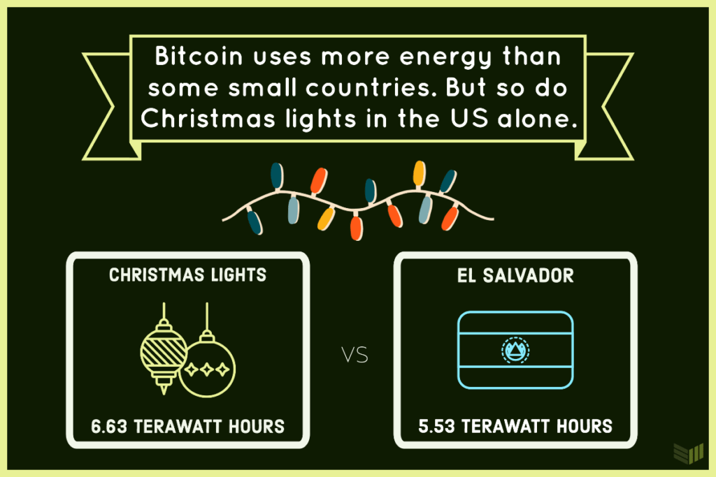 Más bien, la mayor parte del consumo energético de Bitcoin proviene de los mineros que utilizan la prueba de trabajo para obtener recompensas por bloque. Aunque pueda parecer un «derroche de energía» que tantos mineros gasten tanta energía solo para que uno «gane» un bloque, garantiza la seguridad de la red Bitcoin, y yo diría que eso justifica que el uso de energía de bitcoin tenga un lugar en este mundo… bueno, al menos tanto como tus luces de Navidad.