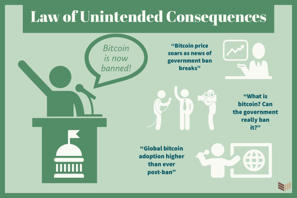 Si el gobierno intenta prohibir Bitcoin o las criptomonedas, lo más probable es que se produzca una gran reacción de la comunidad de criptomonedas que atraiga la atención de los medios de comunicación de todo el mundo, provocando que personas que antes nunca se habían interesado por Bitcoin ahora empiecen a investigarlo.