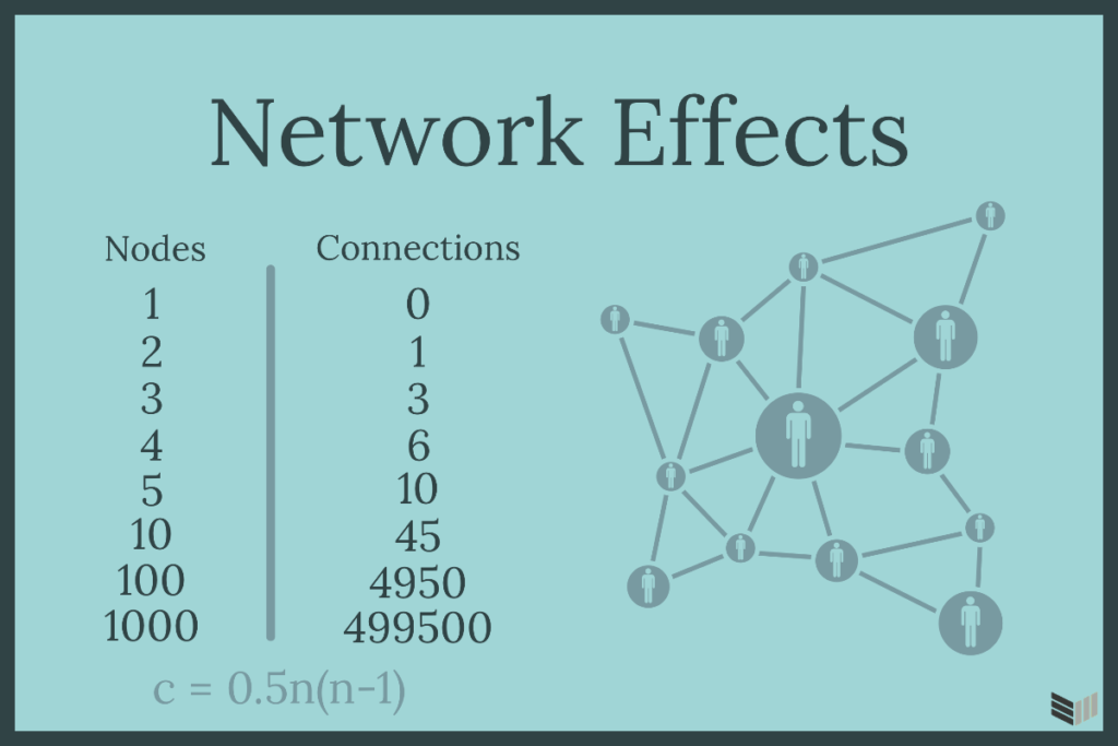 Los efectos de red son un fenómeno especial porque, con cada usuario adicional, no sólo se produce un crecimiento lineal del dominio de la red, sino exponencial. Piénsalo de esta manera: Si Nick y Alex forman parte de la red, establecen una conexión entre ellos. Si Jeremy entra en escena, ahora los tres pueden hacer tres conexiones en total. Si añadimos a Nicole, tenemos seis conexiones.Así es como se verán los números si seguimos añadiendo gente a la red: