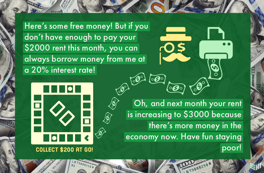 Este es el resultado de la inflación: cuando el gobierno imprime dinero a capricho para alimentar la economía. Pero al final, los ricos sólo se hacen más ricos y el precio de los bienes se encarece, atrapando así a la gente en un círculo de pobreza, aunque cobren 200 dólares en GO.