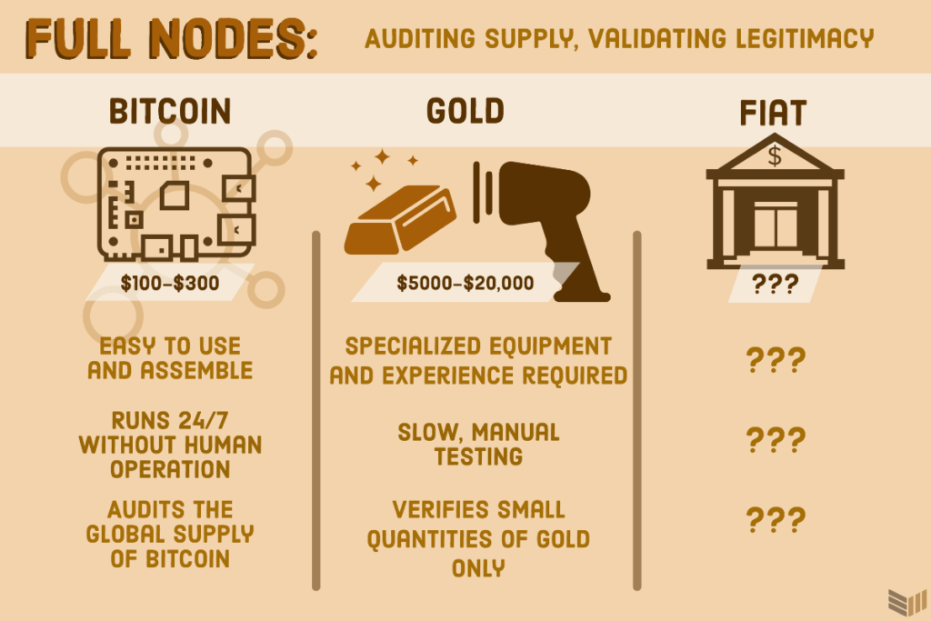 Ejecutar tu propio nodo también te ayuda a eliminar la confianza necesaria para que otros nodos sigan siendo honestos. Aunque la mayoría de ellos siguen siendo verdaderos, al ejecutar transacciones a través de tu propio nodo completo, te estás convirtiendo esencialmente en tu propio banco. Es una característica muy interesante que no es posible con dinero fiduciario, oro o cualquier otra cosa que pueda utilizarse como dinero.