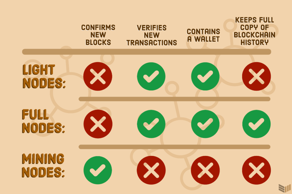 Acabamos de repasar los nodos de minería (también conocidos como mineros), que confirman las transacciones pendientes en la cadena de bloques y extraen nuevos bitcoins. Los nodos completos y los nodos ligeros son los que validan los nuevos bloques y las transacciones enviadas por los mineros.