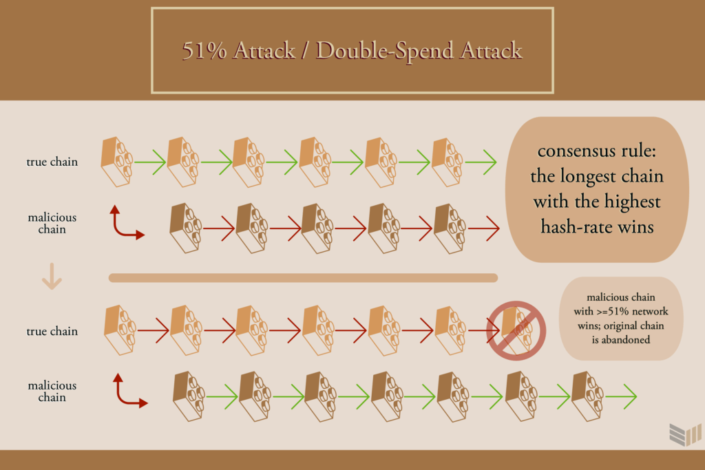 Un ataque del 51% a protocolos de prueba de trabajo como bitcoin puede llevarse a cabo con éxito ya que la red siempre adoptará por defecto la cadena más larga con la mayor potencia de minado como cadena de la verdad.