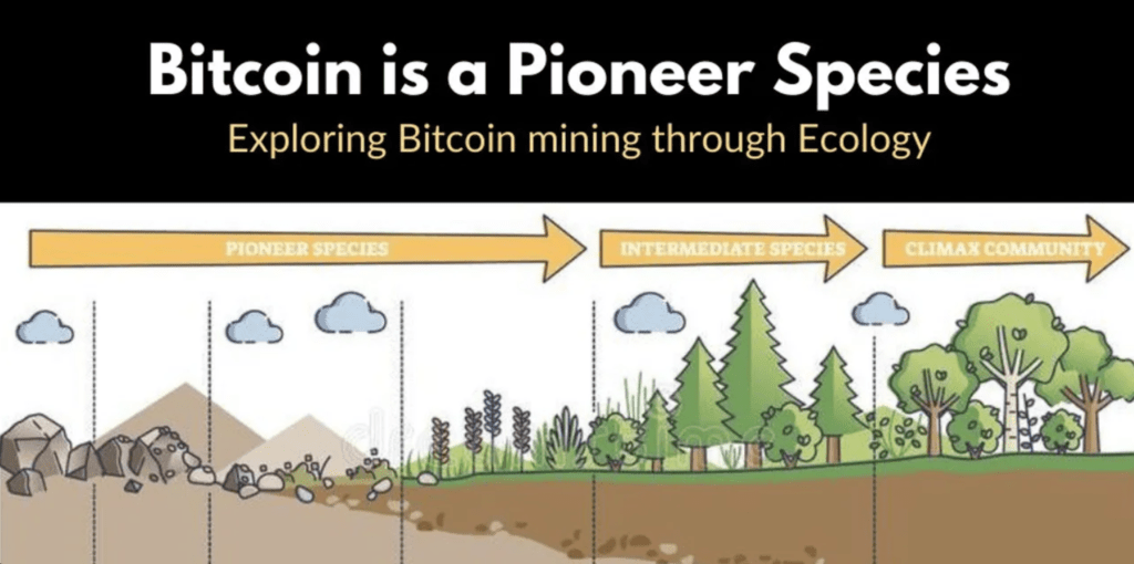 El papel de los minadores de Bitcoin, como especie pionera, es colonizar entornos duros y convertirlos en un sistema complejo lleno de biodiversidad. Las especies pioneras suelen ser plantas, hongos y líquenes.